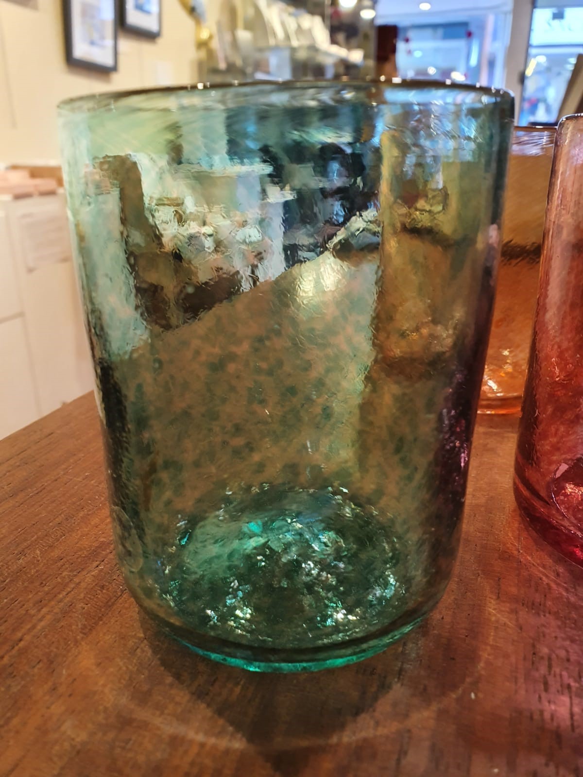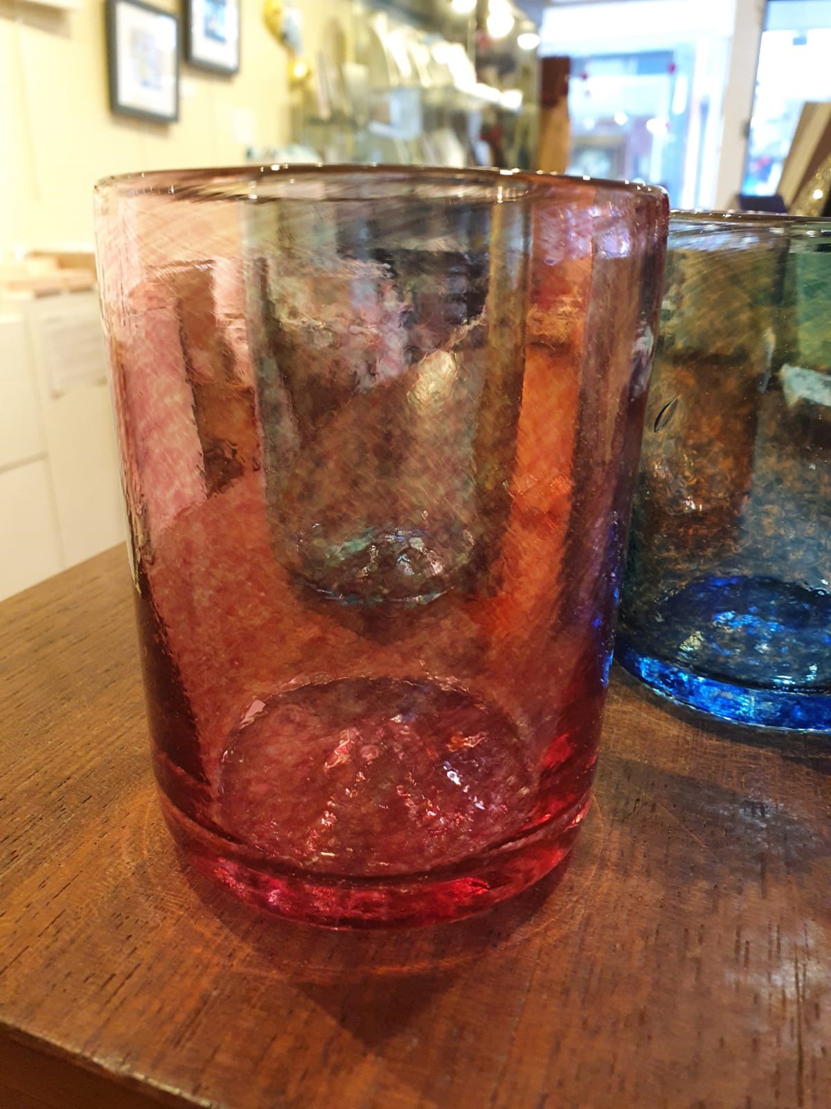 This beautiful and colourful collection of drinking glasses are designed with everyday use in mind. You will not be able to use any other glass after experiencing the daily satisfaction of using hot blown beakers.nnThe clean, simple shape and pure, vivid tones are a reflection of quality craftsmanship and excellence in design.nnHandmade by Jerpoint’s glass-blowers, our Rainbow beakers have a smoothness, texture and quality only achievable with hot blown glass.nnComing in blue, green, pink and orange, each one is 9cm tall.