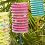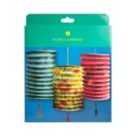 3 colourful boho paper lanterns with fabric tassel. Pink, yellow and blue hanging party decorations in boho floral designs. Perfect for adding a pop of colour to a boho birthday, garden party or summer BBQ.