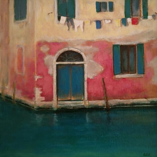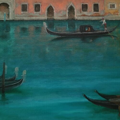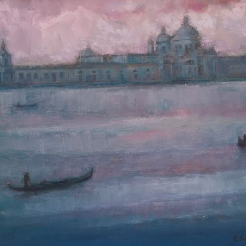 Eugene de Leastar’s recent visits to Venice have inspired this latest body of work. His focus is on the subtleties of the reflections found in the Venetian canals.nnEugene has a deep affection and long relationship with Italy. He visits frequently and is hugely inspired by the beauty and everchanging light of this majestic country. He has a particular love of the whole Venice area and has spent a lot of time there soaking up the splendour of its location, its historic buildings, its very being. The oil paintings in the exhibition allow us a glimpse of this extraordinary city on water. Enjoy the light and colour of this intriguing city which has always had a fascination for artists.nnThis is an original oil painting. It measures 56 x 61cm including white frame.